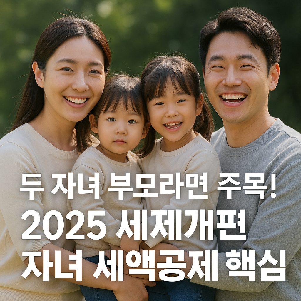 2025 세법개정안 두자녀 가정, 절세 혜택 이렇게 달라진다. 2025년 세법개정안이 발표되면서 두 자녀 가정을 위한 다양한 세제 혜택이 대폭 확대되었습니다.이번 개정안은 저출산 대응이라는 시대적 과제를 반영하여 자녀가 있는 가정, 특히 두 자녀 가구에 실질적인 세금 절감 효과를 제공하는 방향으로 설계되었습니다.세무 전문가들은 “이번 개정안은 두 자녀 부모에게 유리한 절세의 기회”라며, 꼭 챙겨야 할 항목들을 강조하고 있습니다.2025 세법개정안, 왜 주목해야 하는가?최근 몇 년간 저출산 문제는 국가적 위기로 떠올랐습니다. 정부는 이를 타개하기 위해 세제 측면에서도 다자녀 가구 지원을 확대하고 있는데요,2025 세법개정안은 그 정점을 보여주는 개정입니다.특히 두 자녀 가구는 이번 개정의 핵심 수혜자입니다..